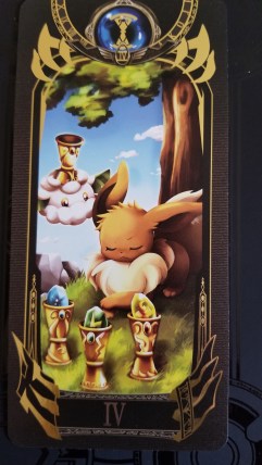 Four of Cups: My specialty is looking introspectively and contemplating decisions. This card depicts an Eevee that is deep in thought, with three cups holding different evolution stones set up before him. This scene indicates that Eevee is trying to mull over the important decision of which evolution stone to choose. However, Eevee is so deep in thought that he does not notice the fluffy Cottonee floating next to him, offering another cup… the option of more unknown possibilities. Keep this card in mind and remember that while this journey may teach you the strength of looking inward to find answers, there are still other possibilities to which your eyes might be blind. Remember to seek advice from external sources as well as through this Pokédeck.