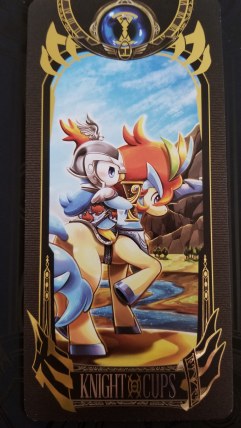 Knight of Cups: My cards are beautiful depictions of Pokémon living together in their world. The artistry of the illustration will inspire and motivate you to keep learning to read these cards. In the Knight of Cups, a Knighted Piplup rides the back of a mighty Keldeo, a water-type Legendary Pokémon, as they pass a small stream. This scene is an imaginative example of the potential outcomes of a reading with this Pokédeck. But while the romantic fantasy shown on this card is enchanting and reassuring, do not be too taken in by my charm. I am still a tarot deck, with deep spiritual messages and lessons to be learned. Just because I am cute does not mean I am not to be taken seriously. Do not have unrealistic expectations that the guidance will be easy or happy all the time. Do not assume that because there are Pokémon on my cards that this deck is for children. Most assuredly, I am not.